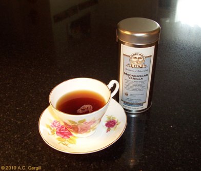 One of the first vanilla teas I tried was a blend of black teas and vanilla beans that was mixed and sold at a little tea shop in a small town in California. A few years back, I was attracted by a wonderful vanilla fragrance and ended up purchasing a pound of Vanilla Honeybush from a store in Chicago (my tea adventures range far and wide). Since then, I have been seeking out great vanilla teas and herbals.