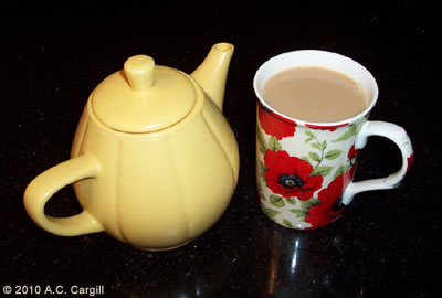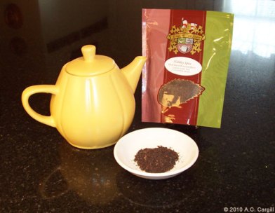 The first infusion is a rich-looking and tasting reddish brown with strong cinnamon and cloves and a bit of edginess. As it cools, that edginess turns into a slight bitterness. A splash of whole milk and a bit of that blue packet sweetener soon smoothes out the edges. Better than that, it brings out the orange flavor. As the tea cools slightly, the orange flavor comes out even more (just as I promised). The taste is great for Spring time events, including Easter, and Summer time teas.
