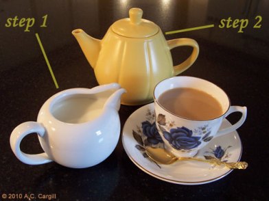 So, I guess milk doesn’t always come first. Dang! There goes my whole sense of some kind of order in the universe. My world has just been thrown into chaos and disarray (sort of like my hair after a night of tossing and turning). Better have some tea. Thank goodness there’s some breakfast blend left in the teapot. Hubby, pour me a cuppa — milk first, please!
