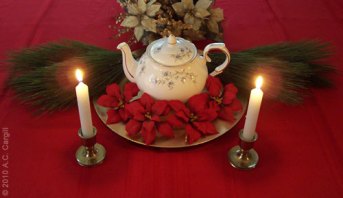 A red tablecloth is a good idea. Then, that teapot sits as the center of the centerpiece on my Christmas table. Around it I arrange evergreen branches in forest green hues, brilliant red poinsettias, and other teawares that are fairly decorative. A candle or two…or three…or twenty…creates lighting that sets a romantic mood as the flames flicker and shine.