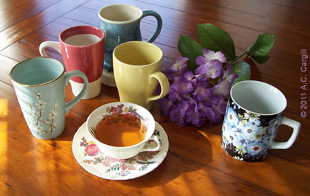 Step 2 — Use teawares with those Springs colors in them. Amsterdam teapots are a good way to start; they’re inexpensive and come in a rainbow of colors: White, Lemon, Yellow, Sahara, Mustard, Tangerine, Red, Amsterdam 2 Cup Teapot – Sierra Rose, Burgundy, Brown, Sea Foam, Lime, Green, Vivian Teal, Powder Blue, Blue, Cadet Blue, Royal Blue, and Plum.