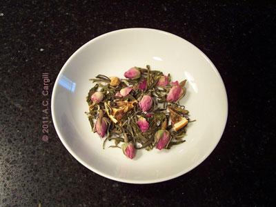 I’ve tried several teas and herbal tisanes with either rose petals, rosebuds, or rosehips in them with mixed results. Some were quite appealing. These included Japanese Sencha Kyoto Cherry Tea (my review), which is the traditional Sencha with Montmorency cherry and subtle rose flavoring; Bingo Blueberry Herbal (my review) that is a blend of blueberry, apple, rose petals, and more; and Buckingham Palace Garden Party (my review), a black tea with strong floral (rose, lilac) and a hint of citrus.