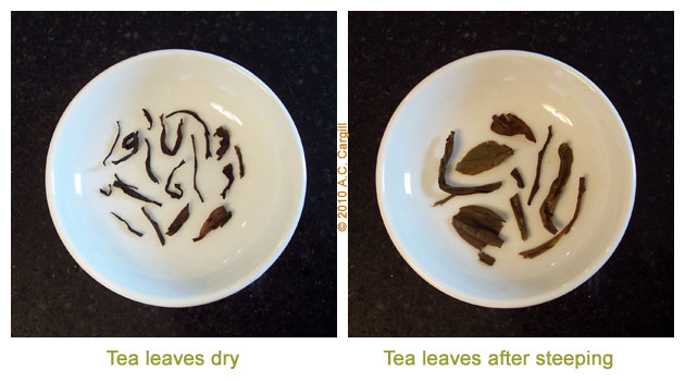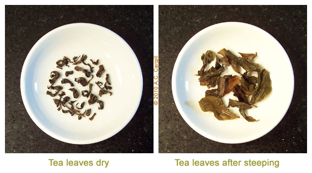 More of that practical approach to reading tea leaves, as begun in my article Reading Tea Leaves — Green Teas. Before steeping, these leaves tell of the process they endured once plucked from the tea bush (Camellia Sinensis). After steeping, they reveal their true nature more fully. Oxidation levels can make quite a difference in Oolongs, from more lightly oxidized tea leaves giving a more planty flavor to the cup and more heavily oxidized tea leaves giving a deeper flavor.