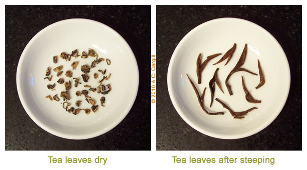 Czar Nicolas Russian Caravan — That smoky Lapsang Souchong flavored from those pine fires used to dry them and a malty Assam that was processed in a more orthodox manner tell of a long tradition of bringing these two very different teas together, one from China and one from India. Larger piece sizes than Breakfast Blend No. 2 above, in part because they start with larger leaves. Again, a reddish tint to the leaves after steeping.