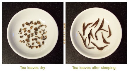 #1 Red Dragon Pearl — The dry tea comes in hand-rolled balls about the size of a chickpea (per the vendor’s site) and unfurls nicely during the steeping. The rolled up “pearls” tell of skilled fingers but don’t show you what the leaves are like. After steeping, however, you can see the tender two leaves and a bud combo, which tells of skillful plucking of those leaves from their mother tea bush.