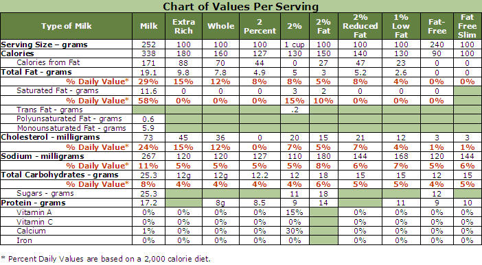 Then, I came across a bunch of charts about the various values in milk, such as calories, types and amounts of fat, and vitamins. I combined these into one chart for ease of reference. There are several versions of 2%, so I included them all, since their values are different.