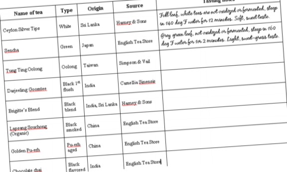 - Pens, and our Taster’s Form, downloadable in *.pdf format – filled in with basic information about each tea – for taking notes.