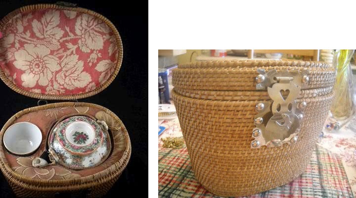 On to popover cozies, starting with various types of traveling tea cozies, where you put the teapot into a container that closes up so you can take it with you. In the old Mr. Wong films with Boris Karloff, his servant always brought tea in a covered wicker basket cozy with a handle. The basket had built-in compartments for teapot and cups. These types of cozies can be found on occasion in antique shops or on eBay. Tea pluckers carry their tea into the fields in a fitted basket too, although of a somewhat different design than Mr. Wong’s. These feature a lid fashioned in the shape of the sunhats worn by the pluckers.