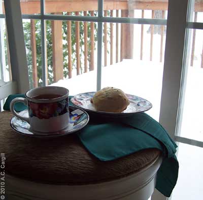 The good thing about everything shutting down is that all those folks can be home enjoying tea. Oh wait, around here they mostly only drink that iced, sweetened stuff. Not in this house, though. And we don’t need snowfall to get that kettle going. But that mere dusting (as we would call it back home) sure does lend a nice cozy atmosphere to teatime.