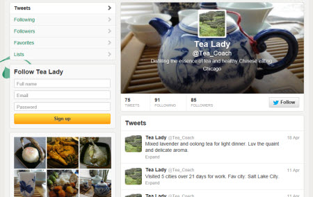 - @Tea_Coach — The other day on Twitter I came across a “tweep” whose Twitter persona was “Tea Lady” and Twittername was “@Tea_Coach.” Hm…could this be the one and only and true Tea Lady? The description of this person (who may or may not be female) was: “Distilling the essence of tea and healthy Chinese eating.”