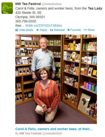 - Tea Lady — A “…family-owned business established in 1994 in Olympia, Washington, …specializing in tea and everything for tea. …over 700 teas and herbal infusions. …candies and cookies including some gluten-free items, sugars, honeys, and British teas, beverages and biscuits …lots of variety in teapots, water kettles, cups, travel mugs and sipping cups, infusers, tea cozies.” (photo posted on Twitter by @nwteafestival)