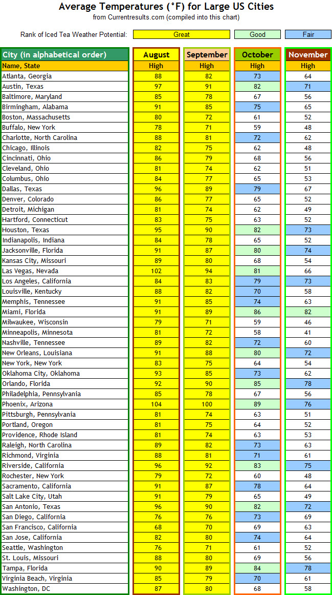 To be on top of every moment of iced tea potential now through November, I have compiled this list of average high temperatures for August, September, October, and November of this year (2014). If you live in or near one of these cities, you can see at a glance how much iced tea weather lies ahead during those months.