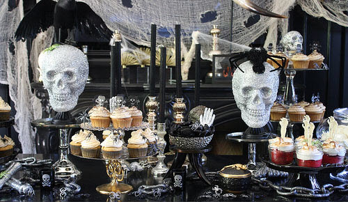 Black is a great color. So are orange and red. They can be calming or inspiring. But they can also be arranged in such a way as to convey quite a ghoulish atmosphere. If you find yourself swapping your brighter, gayer colors for these, you are well on your way to a “ghoulish” tea time. Add in some skulls, black cats, ravens, oversized spiders, and “things that go ‘bump’ in the night,” and you will be mostly there.