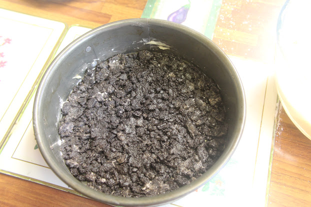 Make the base by combining all but three of the crushed biscuits with the softened butter and press 2/3 of this mixture into a 8″ spring form tin and leave to cool.