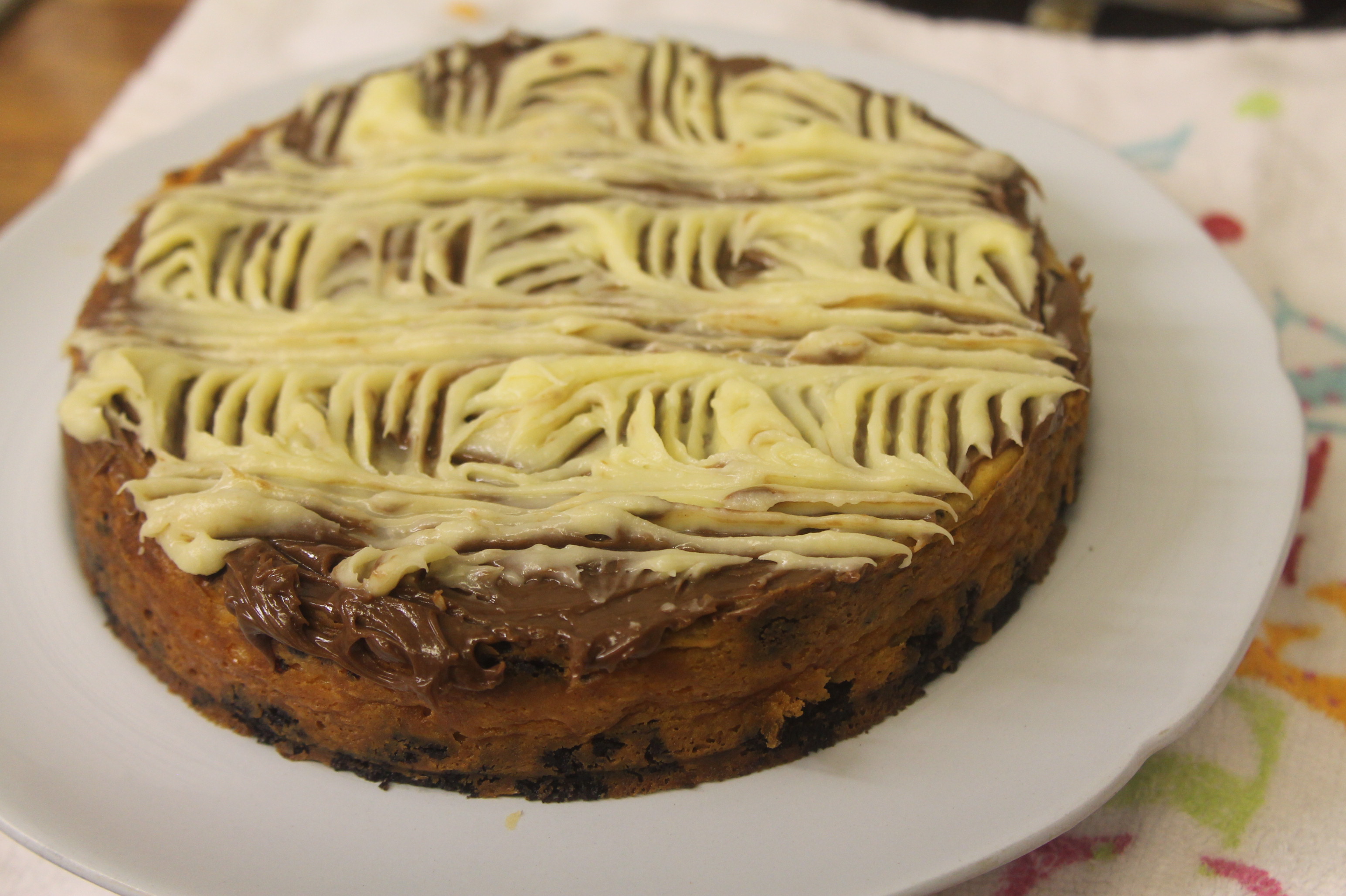 For the topping melt the dark chocolate and mix with 3 oz cream, melt the white chocolate in a separate container and mix with the remaining one oz of cream. Spread the dark chocolate over the entire cake top and drizzle on the white chocolate. Use a fork to create a pattern on top and, presuming you still have the 3 biscuits you did not use in the base then use these to decorate the sides. Mine had mysteriously disappeared when it came to this part!!