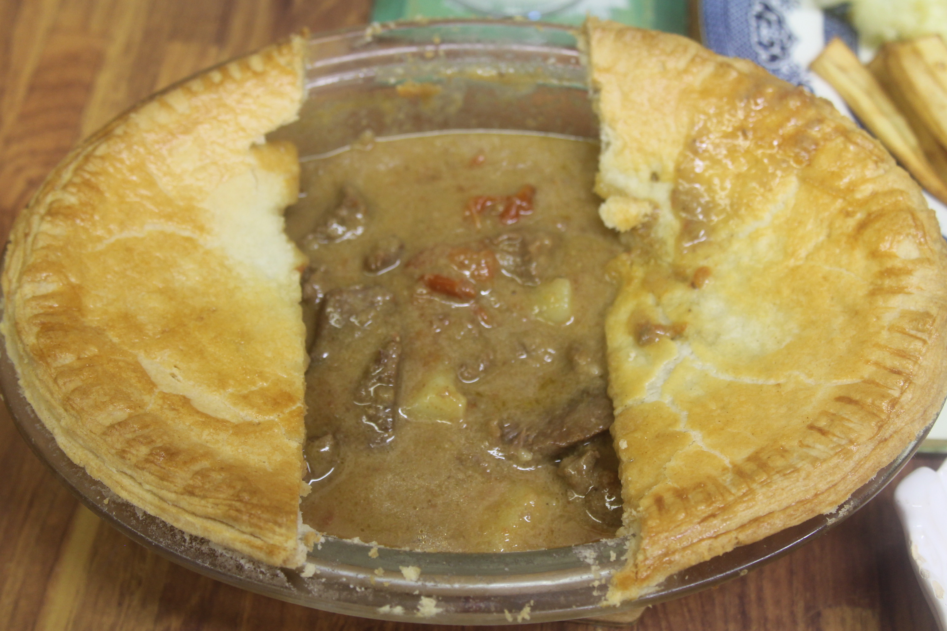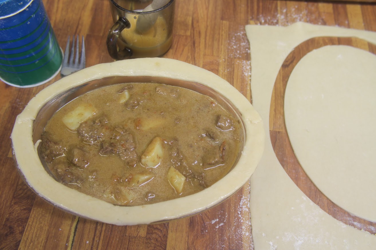 When cooked add the potatoes, roll out the pastry and use it to line a pie dish, add the potatoes and meat and top with the pastry crust. Brush with egg wash and bake in a hot oven for 20 minutes.