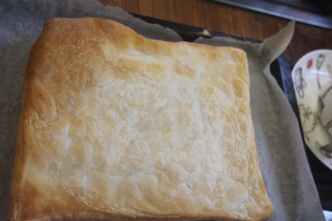 Divide the pastry into two equal pieces and roll out both pieces to about an 8 inch square about 1/4 inch thick. Place each pastry square on a lined baking sheet and bake for 10-15 minutes at 220C/425F/Gas 7 until golden brown and crisp. Allow to cool.